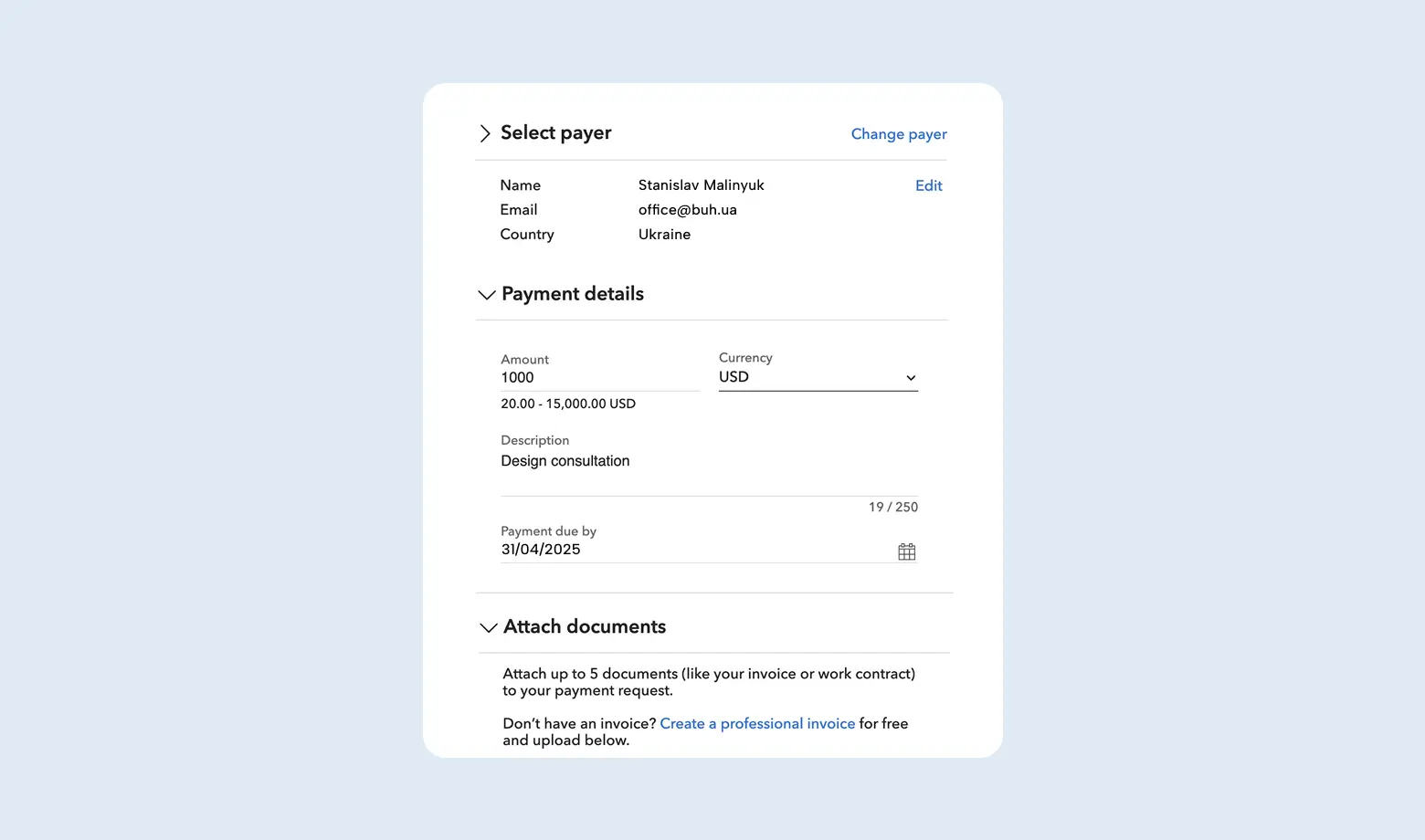 - Введіть суму, валюту та детальний опис послуги (наприклад, “UI/UX Design for Mobile App”).
