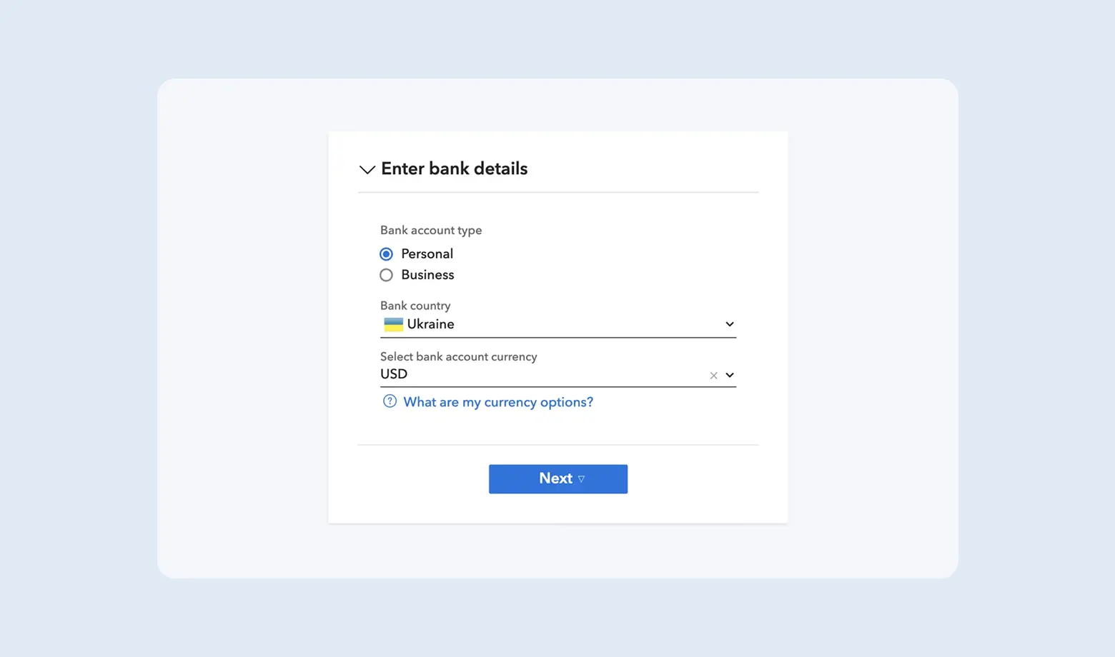 Важливий момент: навіть якщо плануєте користуватись виключно карткою Payoneer і ніколи не виводити гроші на український банк, рахунок все одно доведеться вказати при реєстрації. Це технічна вимога платформи. У майбутньому просто користуватиметесь карткою, а інформація про рахунок залишиться “про запас”.